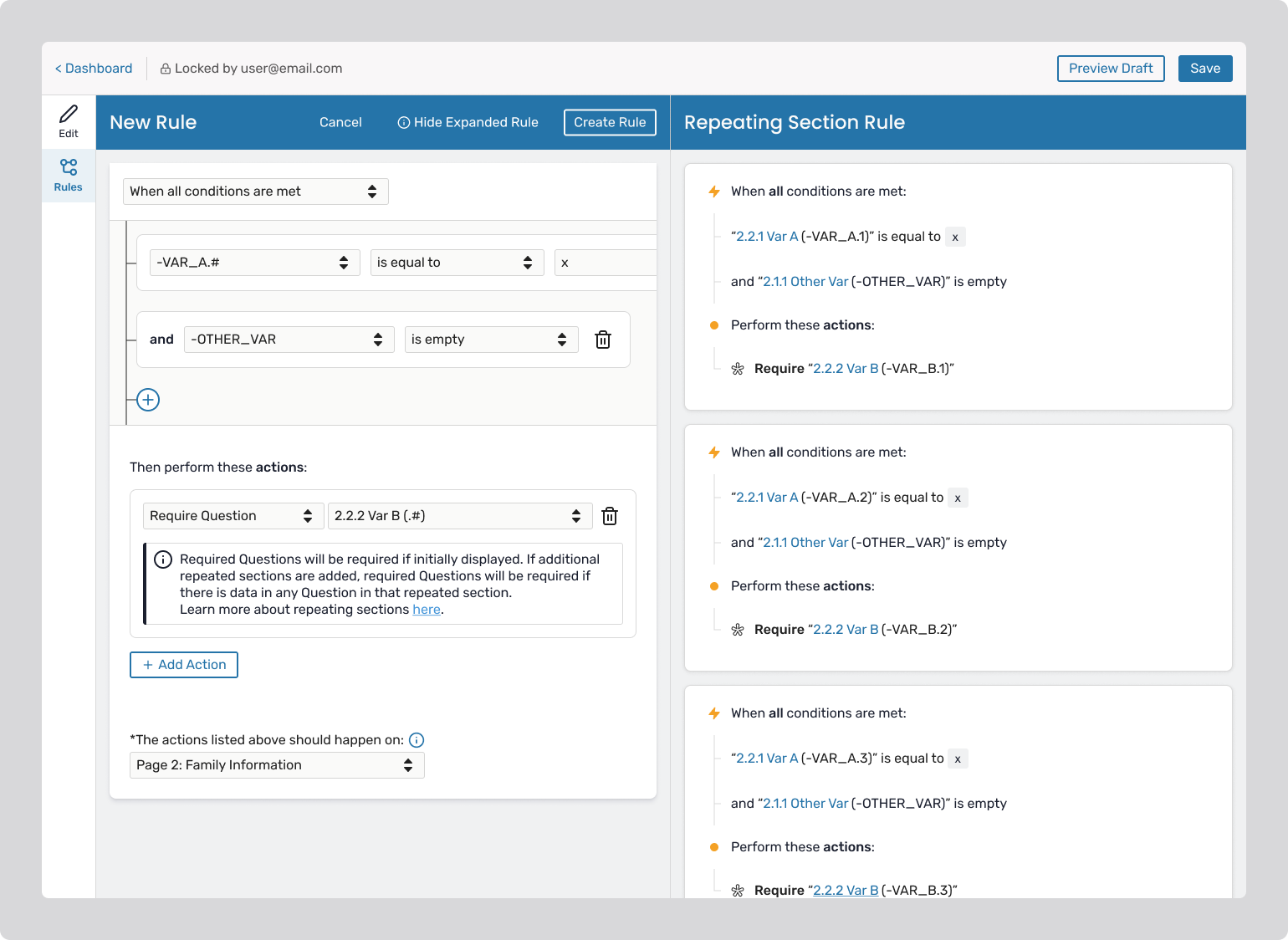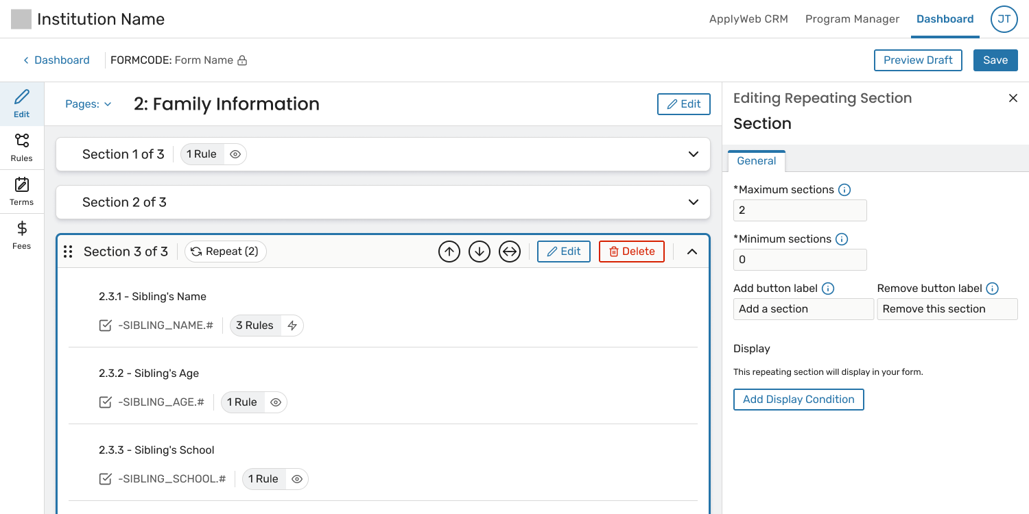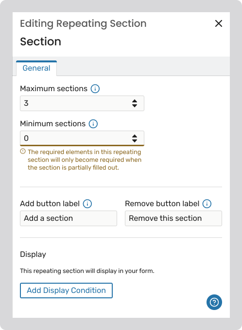 Problem: Early designs for repeating sections relied on multiple numerical controls, such as separate fields for “number of sections to display” and “number of sections required.” While technically flexible, this approach introduced significant confusion.